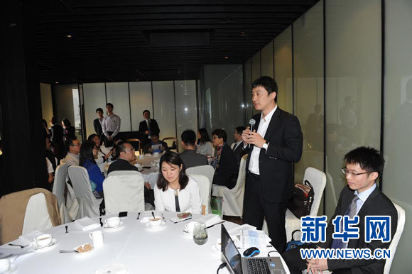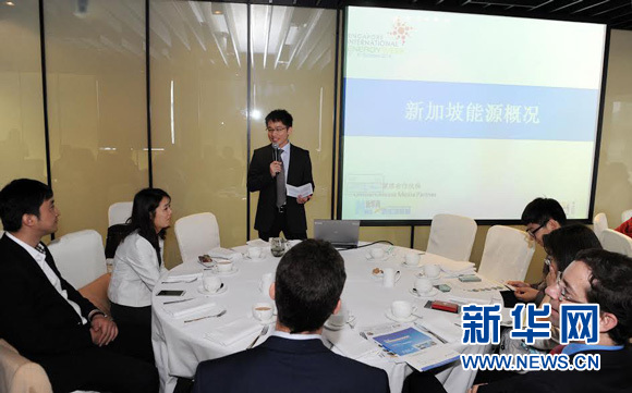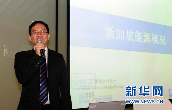 图为2014新加坡国际能源周上海招待会上ღ✿,新华网新加坡频道总经理吴磊先生作为嘉宾介绍新加坡能源市场现状